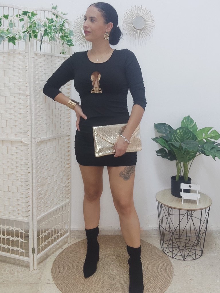 Vestido de canalé con apertura en el pecho con adorno dorado. Talla única: (36-40).