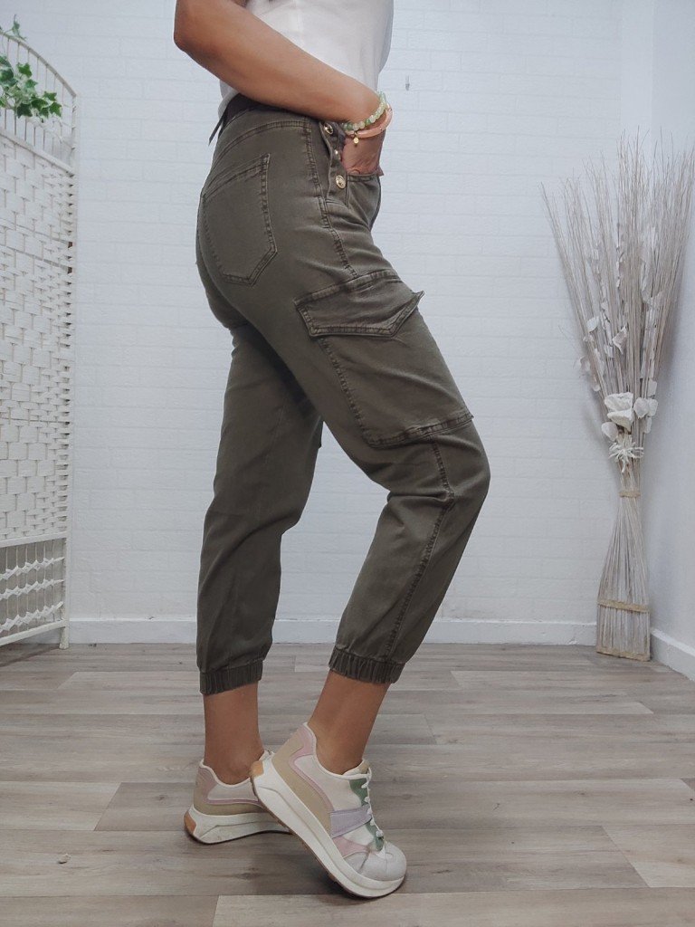 Pantalón estilo cargo ,.Cierre de botón y cremallera ( incluye cinturón) Dispone de tres botones color plata a modo decorativo . Bolsillos laterales, traseros y en el lateral de la pierna. Terminación de la pierna en goma elástica. Talla XS/S/M/L XL.