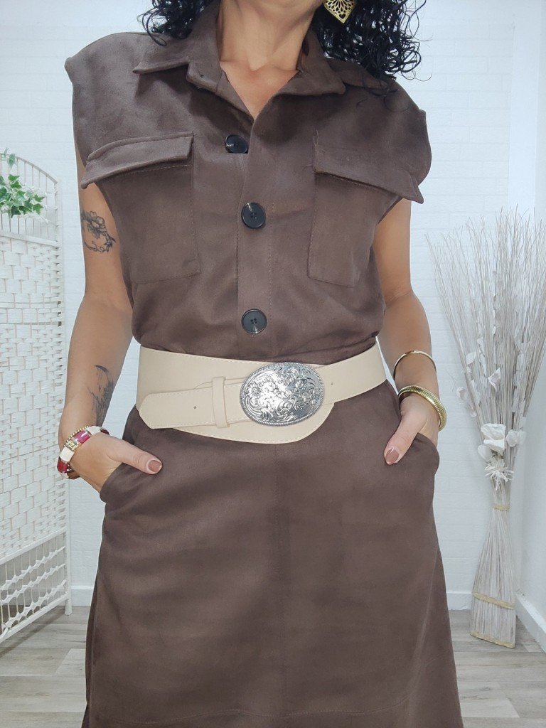 Cinturón en polipiel con el detalle de un lado más ancho que otro. Detalle de la hebilla color plata.