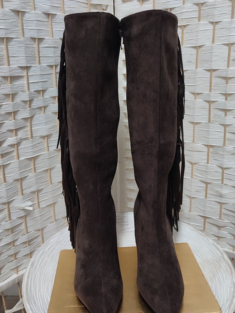 Preciosa bota que te enamorará nada más verla. Es una bota en material de antelina con forma de pico en la punta. Lleva flecos en el lado exterior y cremallera por la parte interior.
