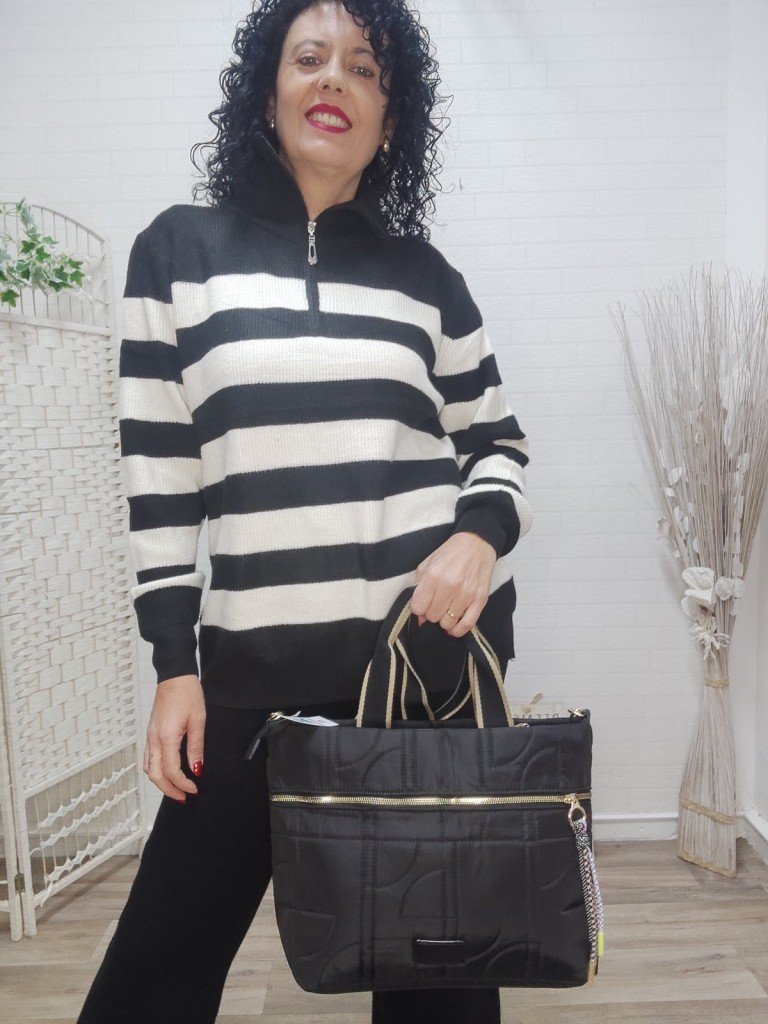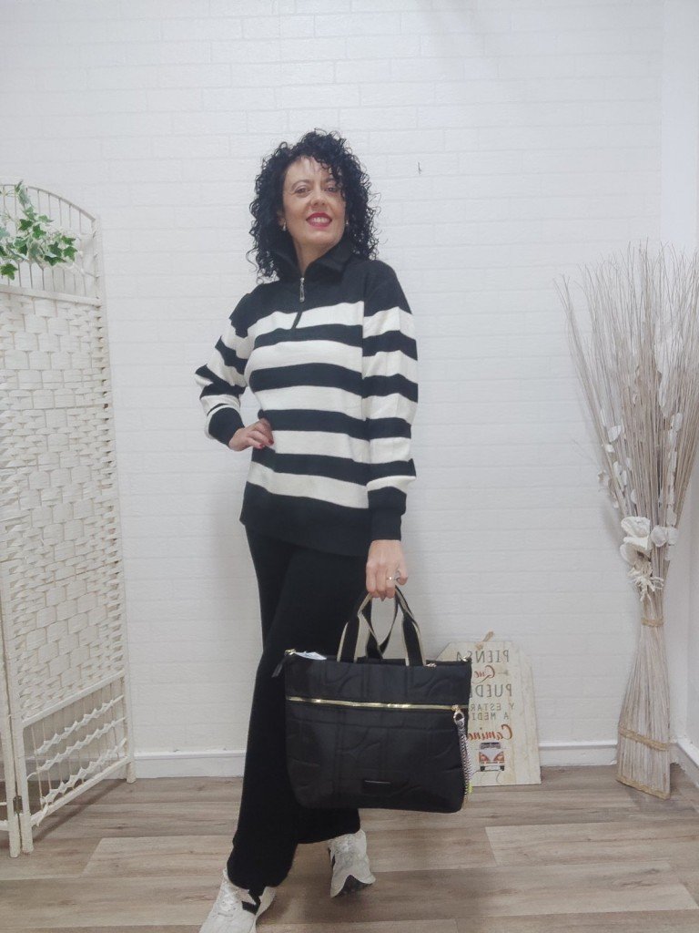 Conjunto de punto doble, con un jersey de rayas, con cuello subido y media cremallera en la zona del cuello. El pantalón también es de un doble punto calentito con cintura elástica , tipo palazo.