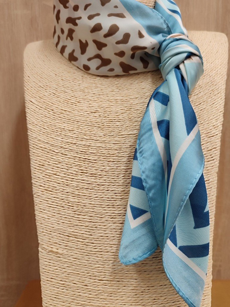 Precioso pañuelo satinado, con unos toques de azul, celeste, marrón y camel. Una combinación que no falla en la nueva temporada.
