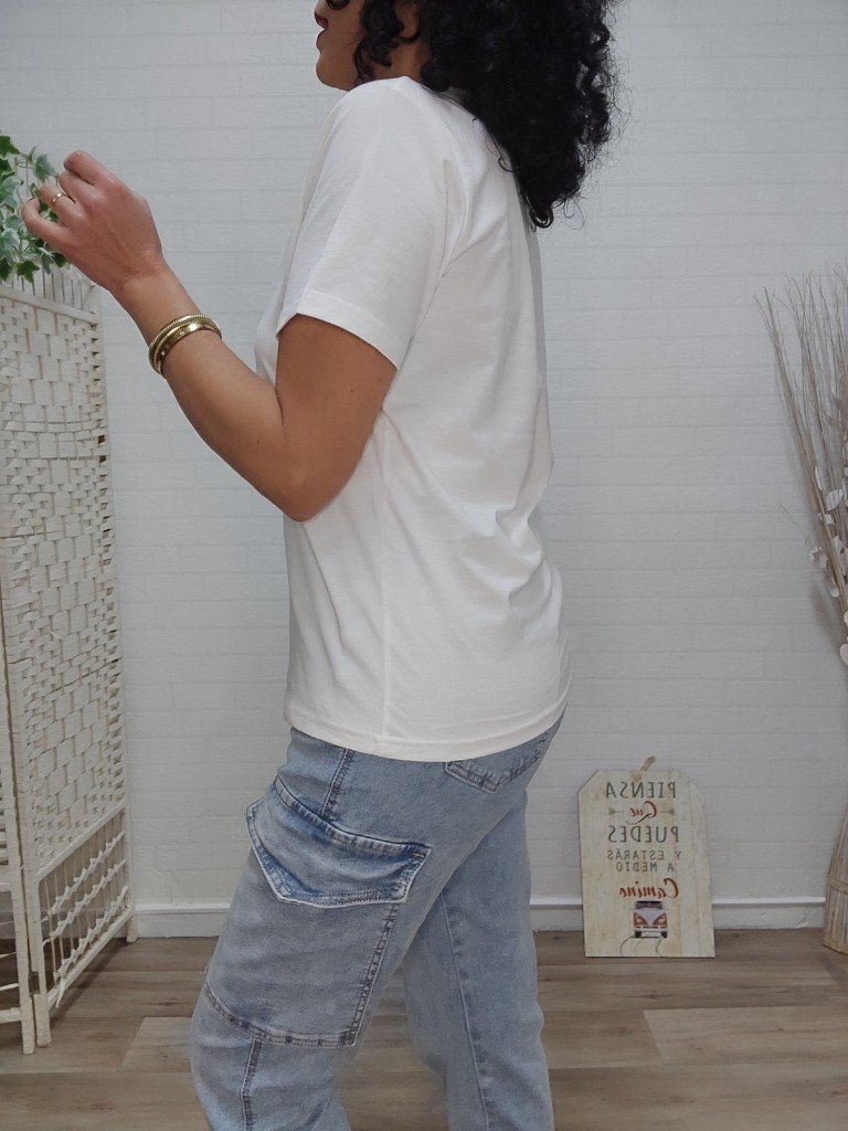 Camiseta blanca básica, manga corta. Dibujo frontal con detalles en color dorado.