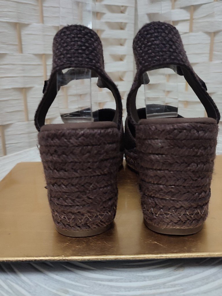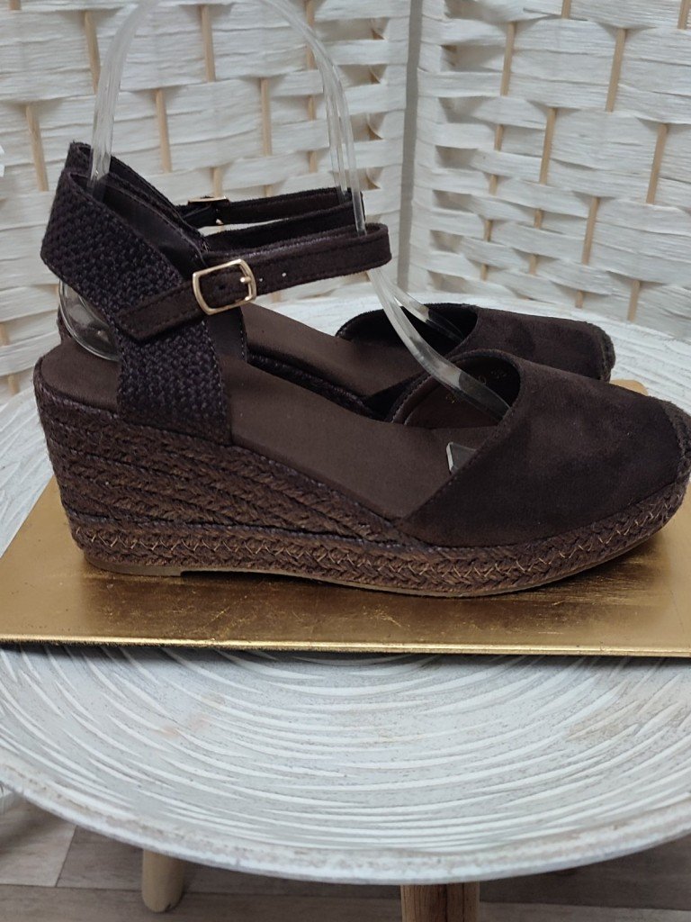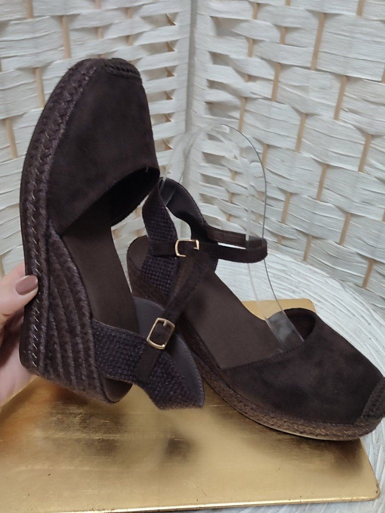 Cuñas de esparto en color marrón chocolate abrochadas al tobillo diseñadas para ofrecer comodidad real al caminar. Están diseñadas con el empeine en antelina . La cuña de esparto aporta altura sin resultar pesada, ya que gracias a la plataforma delantera le resta altura.