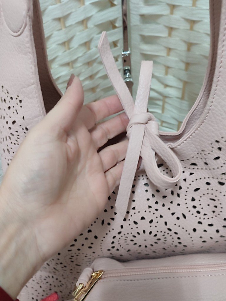 Conjunto de dos bolsos en color rosa palo. El bolso principal destaca por su hermoso diseño calado láser con motivos florales y de mandala que le aporta un aire bohemio y chic. Sus asas son anchas e integradas al cuerpo del bolso. Cierre de cremallera y lazada. Bolso interior es liso de estructura suave que puedes utilizar de forma independiente como un práctico bolso de mano o bandolera.