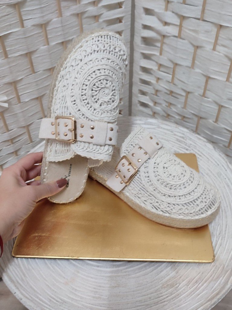 Calzado tipo zueco plano en color beige. Empeine en crochet con patrones circulares y detalle de correa frontal con hebilla metalizada y detalle de tachas que aportan un estilo moderno. Suela ligera con acabado en yute.