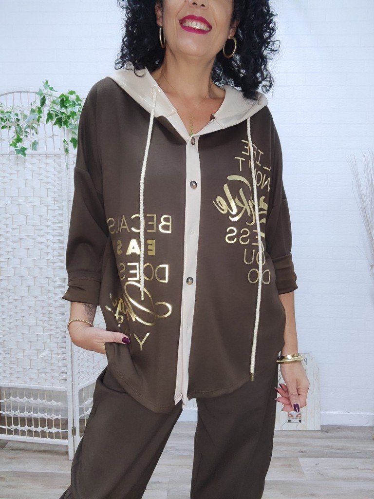 Sudadera deportiva con capucha en brillo, su cierre es de botones. Es un estilo oversize. La parte de la espalada es más larga que la delantera.