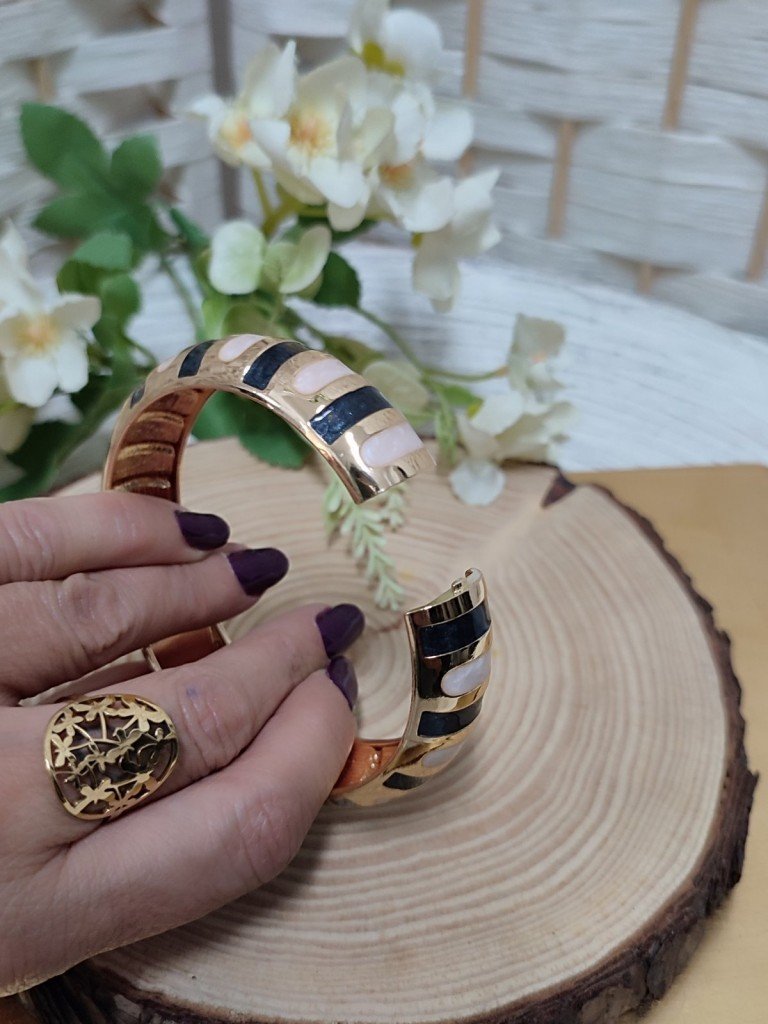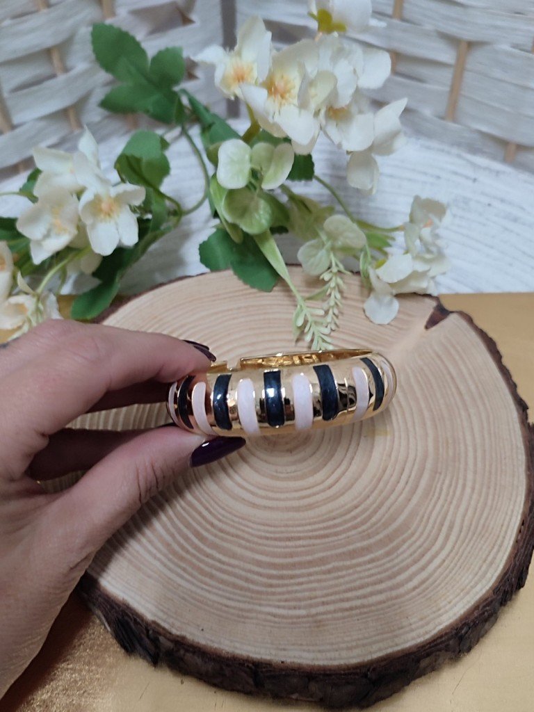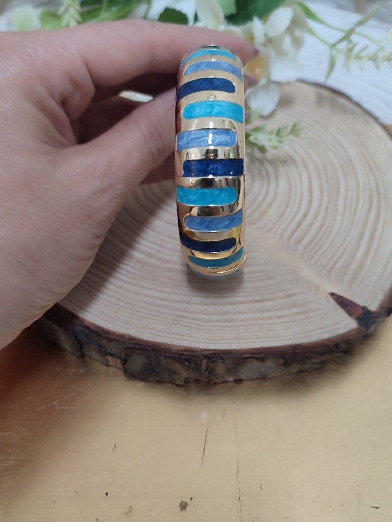 Pulsera tipo brazalete en tono dorado decorada con líneas en tono azules , su cierre es de clip imantando.