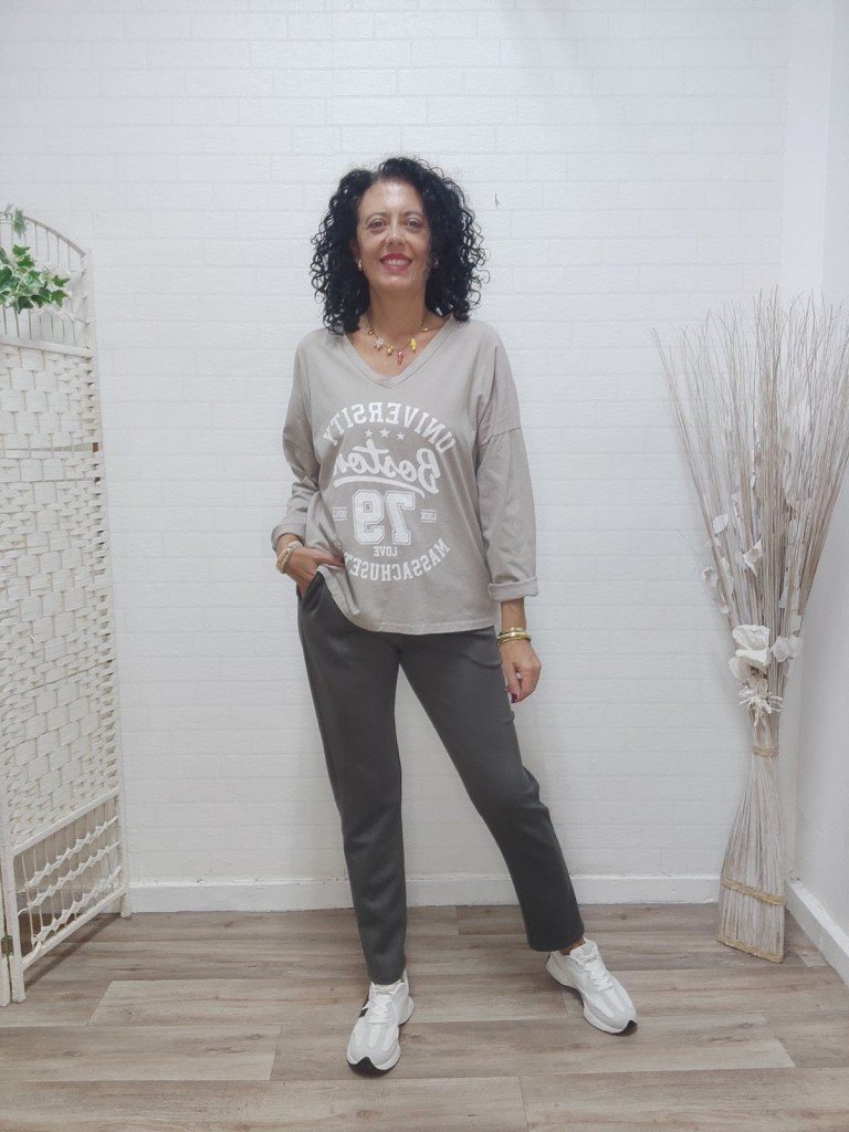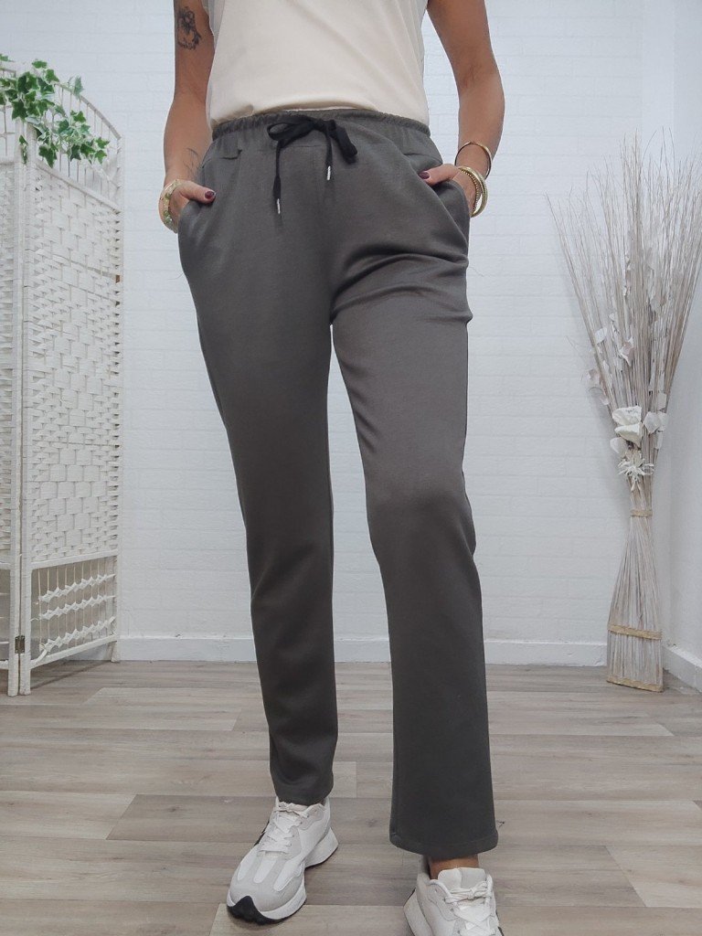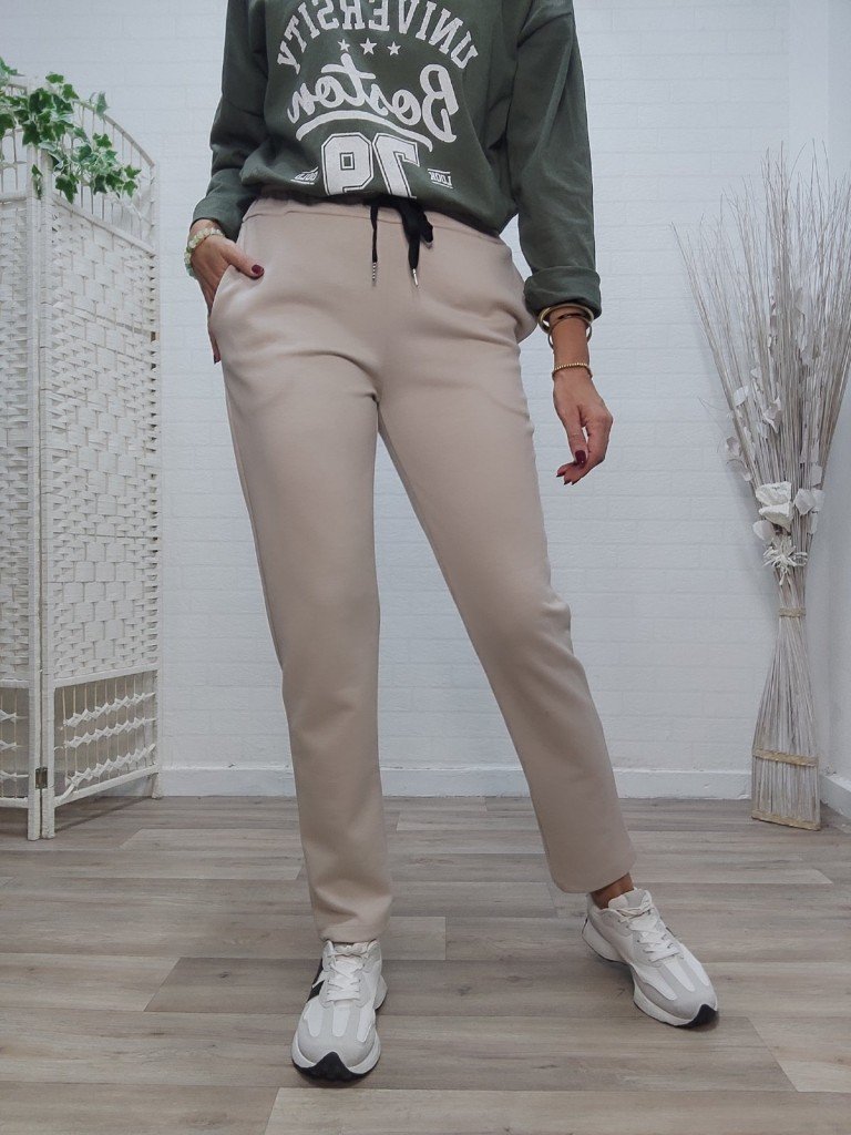 Pantalón elástico en tejido deportivo, con lazada ajustable. Es un modelo deportivo de corte recto. Lleva bolsillos. Combínalo con la sudadera de rayas.