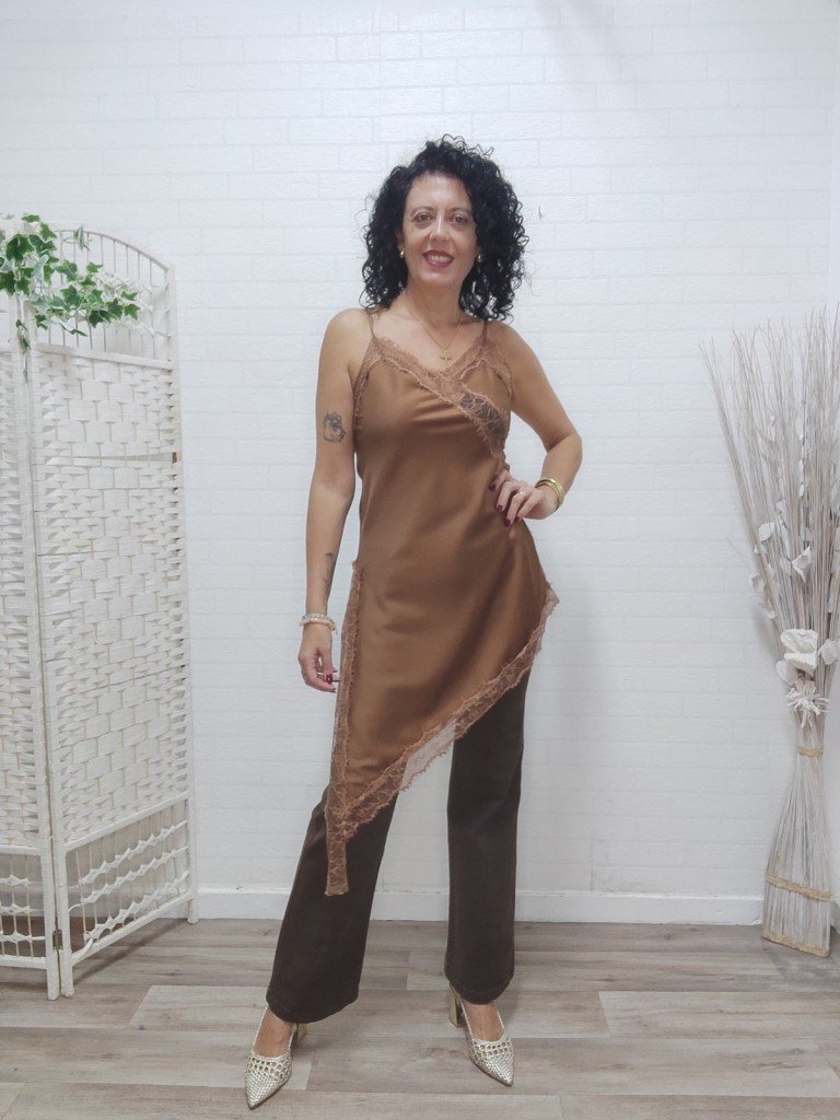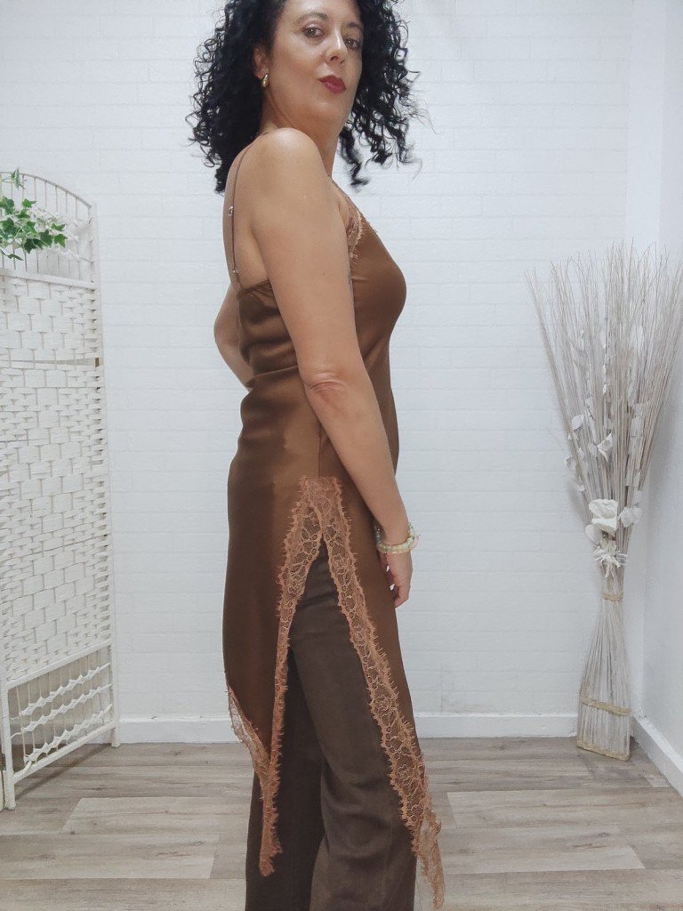 Lencera de vestir satinada con encaje y tirantas elásticas regulable, su corte es en pico y en la zona más larga acaba en pico con apertura en el latera. NO INCLUYE COLLAR ( COLLAR CATRICE).