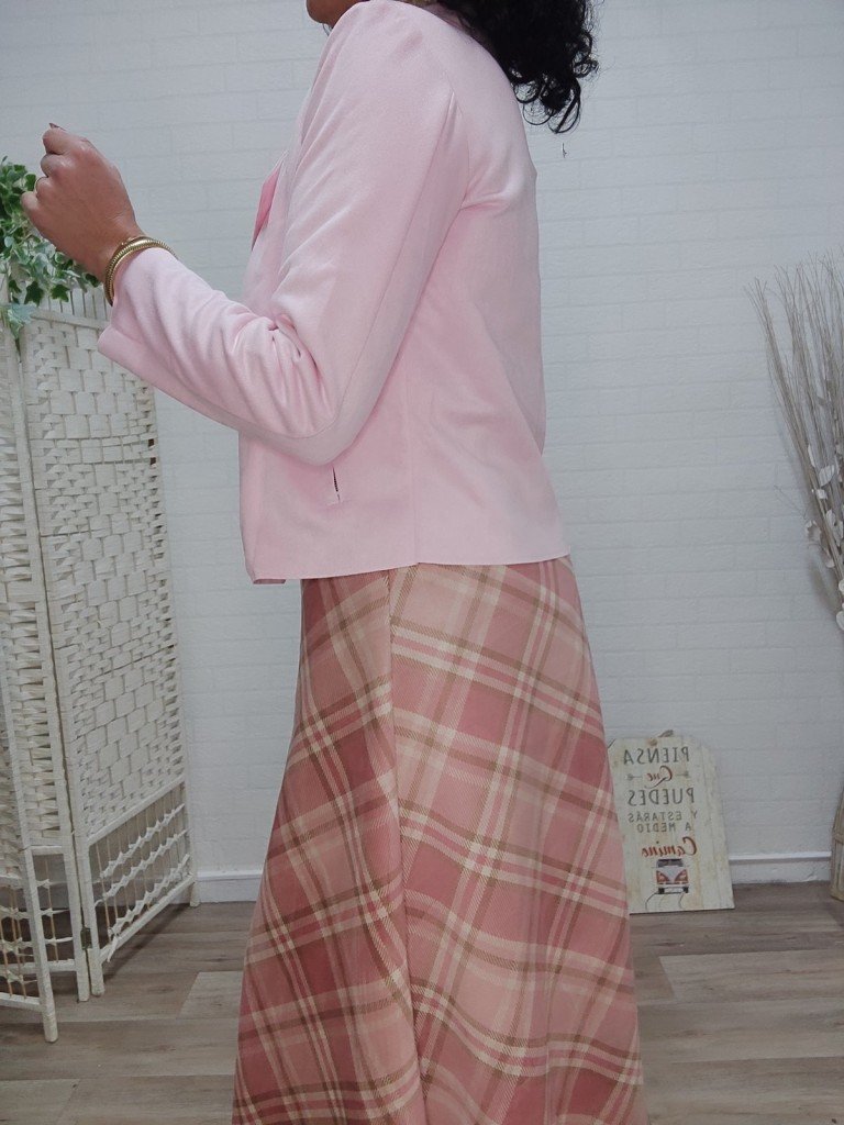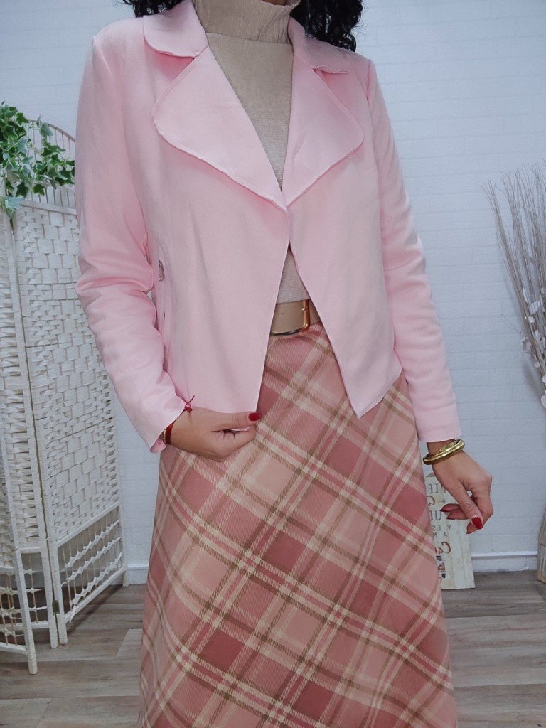 Chaqueta de antelina sin cierre, lleva el cuello con solapa, lleva bolsillos con cierre de cremallera. Es un modelo elástico.