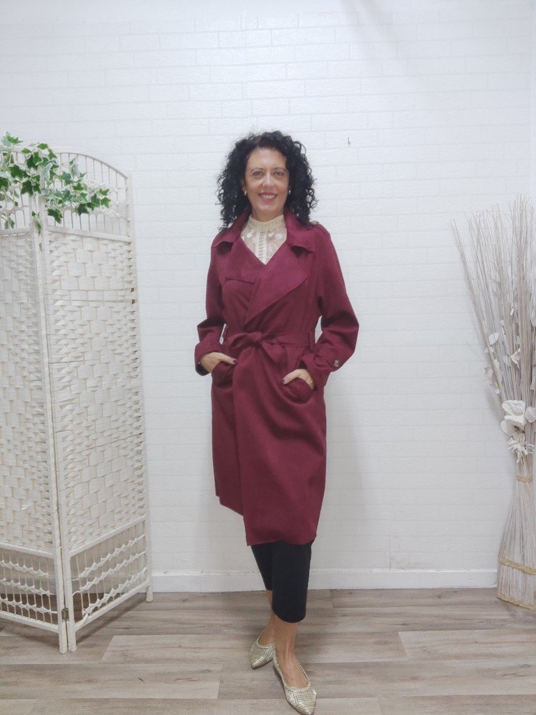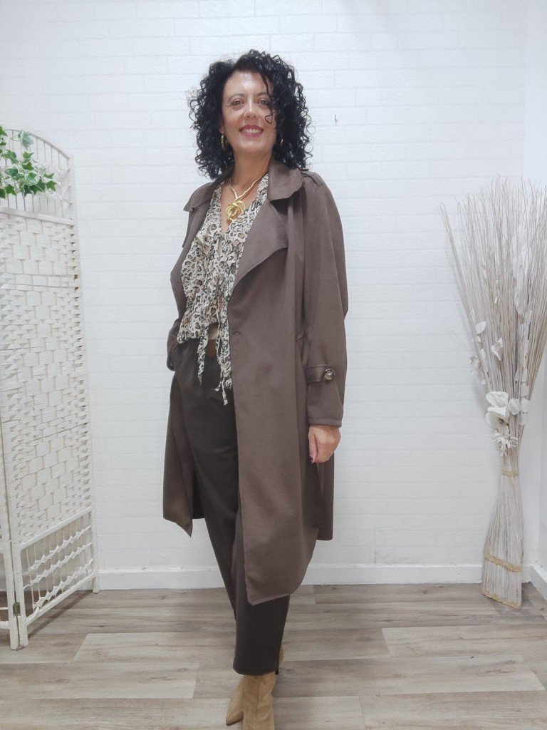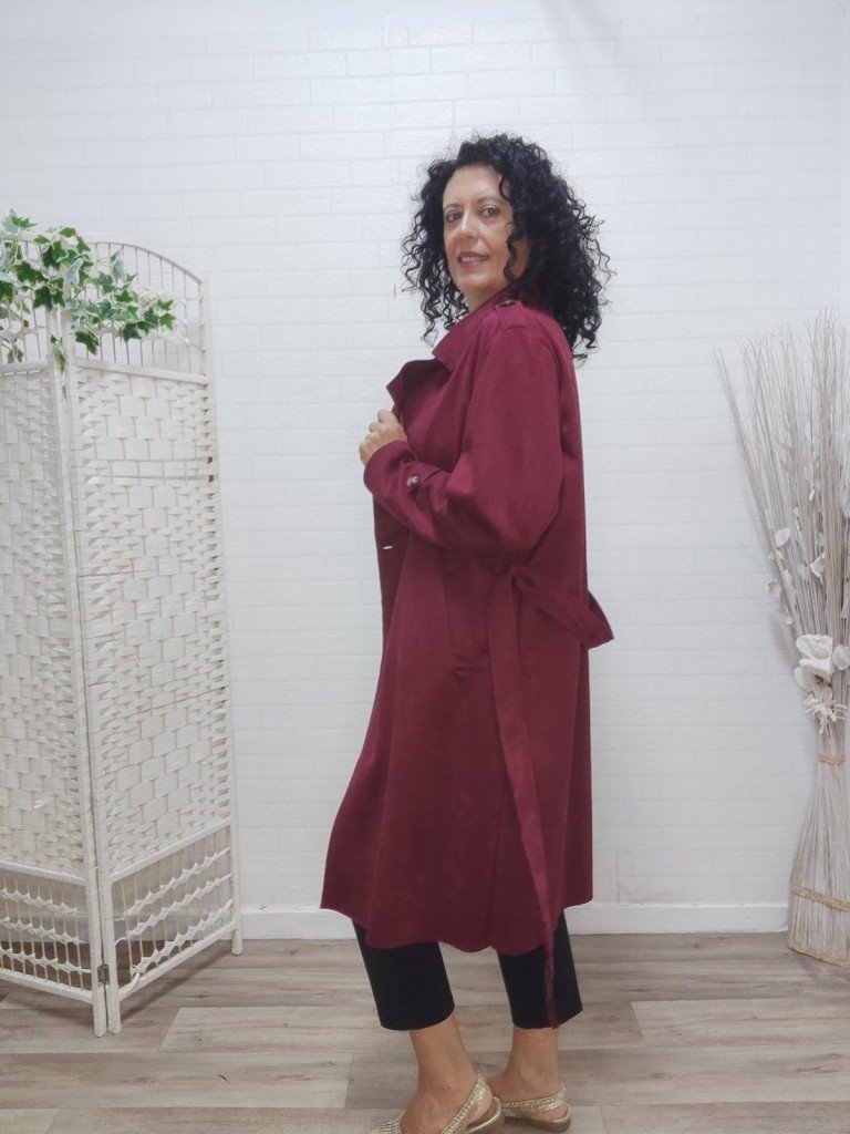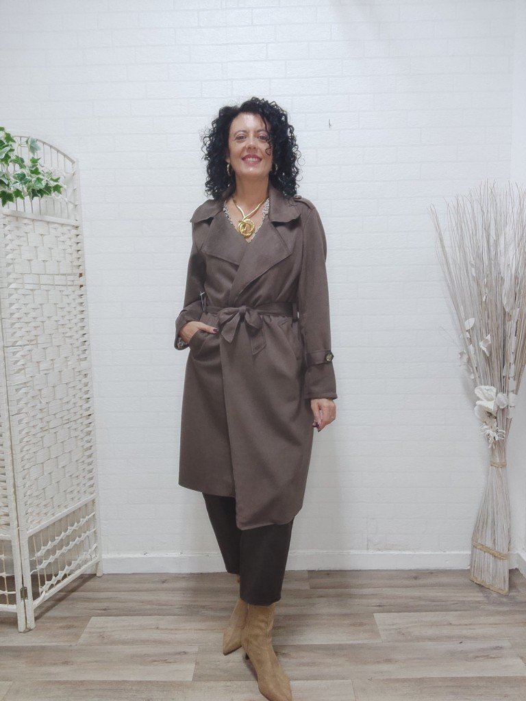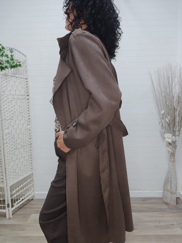 Gabardina larga de antelina , con cuello en forma V y solapa , su cierre es con botón más lazada . Lleva bolsillos.
