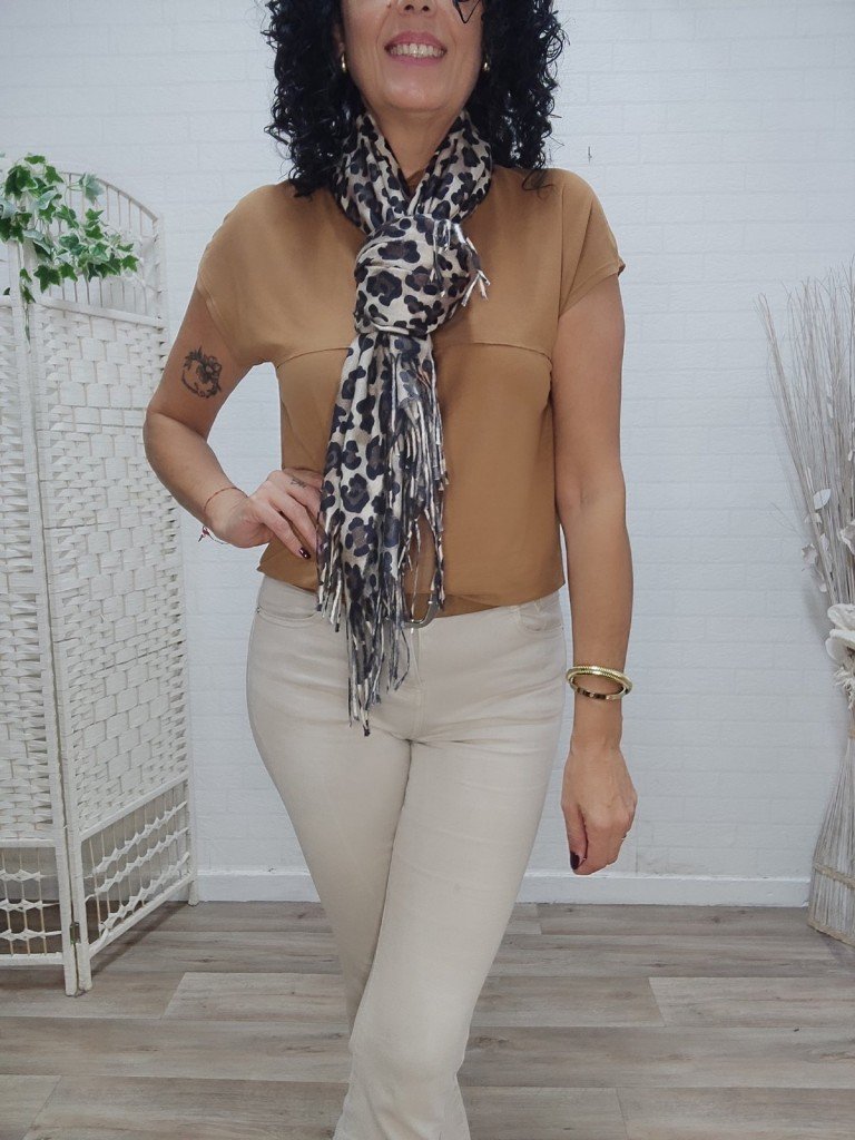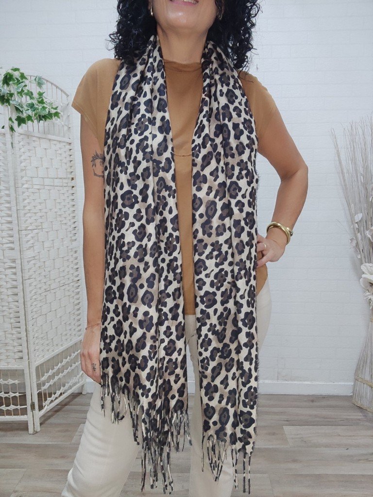 Pañuelo en un tejido súper agradable ,con diseño en animal PRINT. Terminación en flecos ( NO PICA NADA).