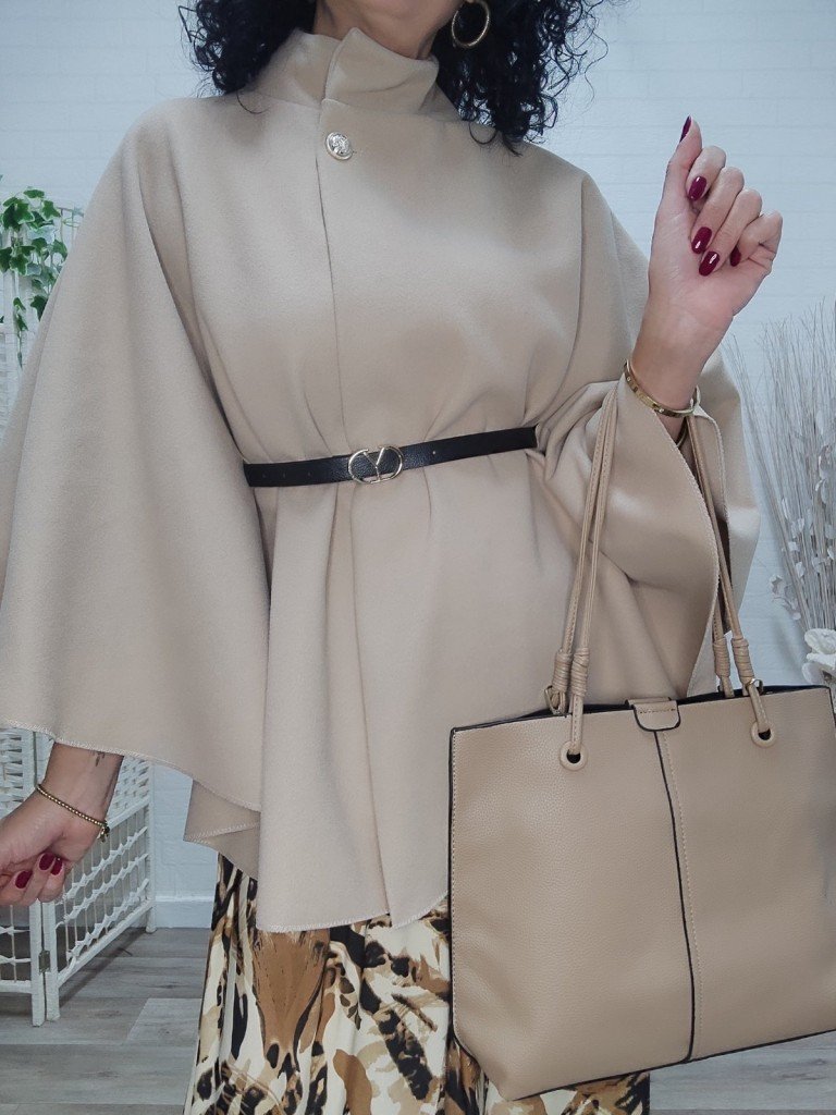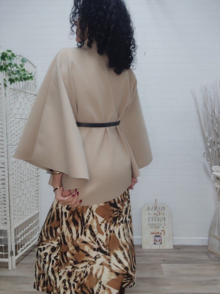 Preciosa capa con un tejido muy suave y calentito, lleva un cinturón fino para cerrar y cierre con un solo botón en la parte del cuello.