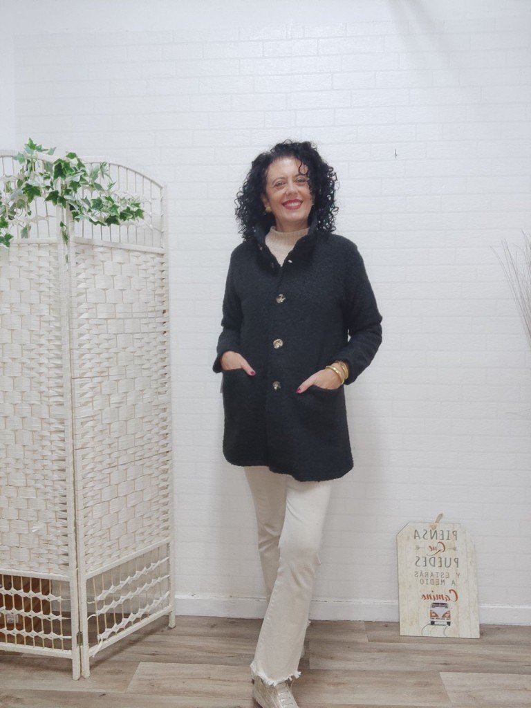 Abrigo de paños con cierre de botones , lleva bolsillos. Es un abrigo que no tiene forro pero su material es muy calentito y suave.