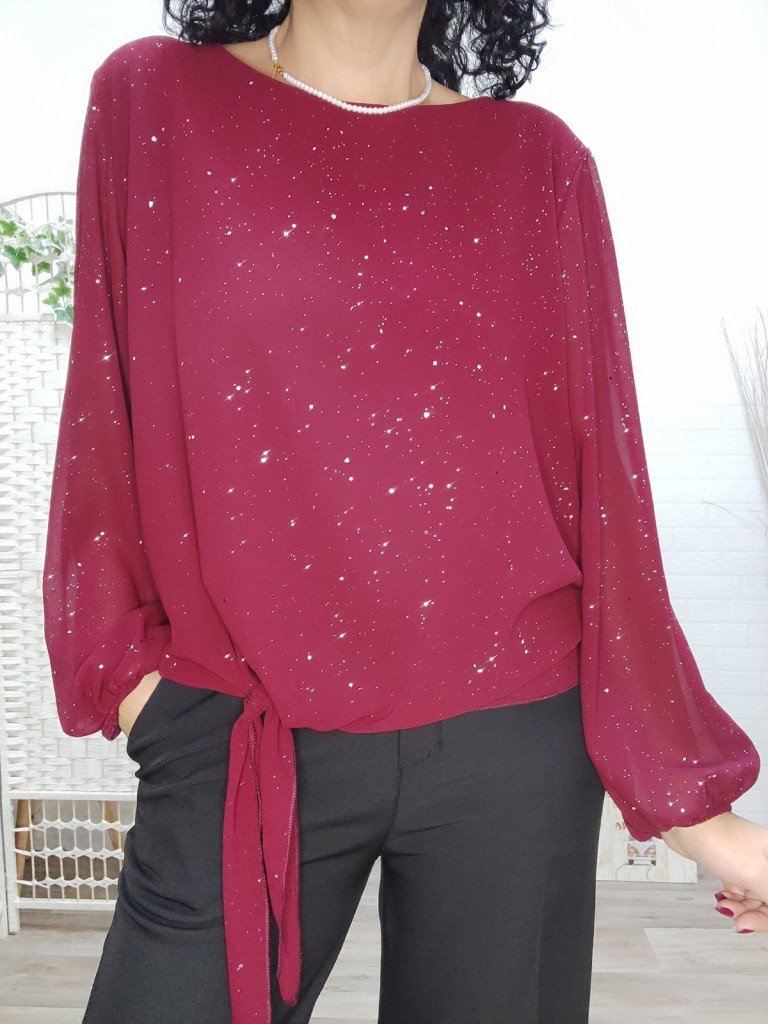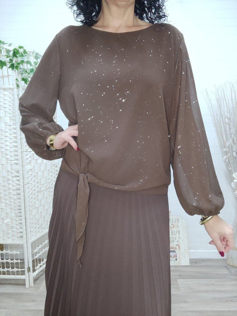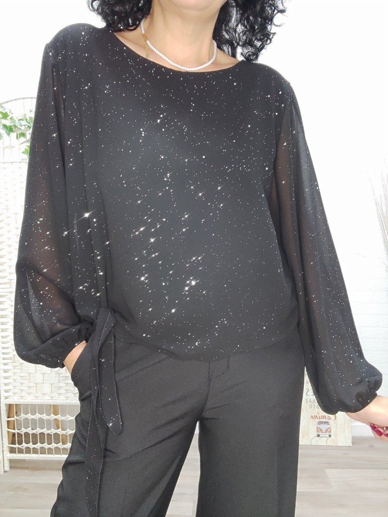 Preciosa blusa de gasa satinada con brillito de destelllos en tonos plata, la parte del pecho si lleva forro, dejando así las mangas transparentes. Lleva una lazada en la zona delantera en medio.