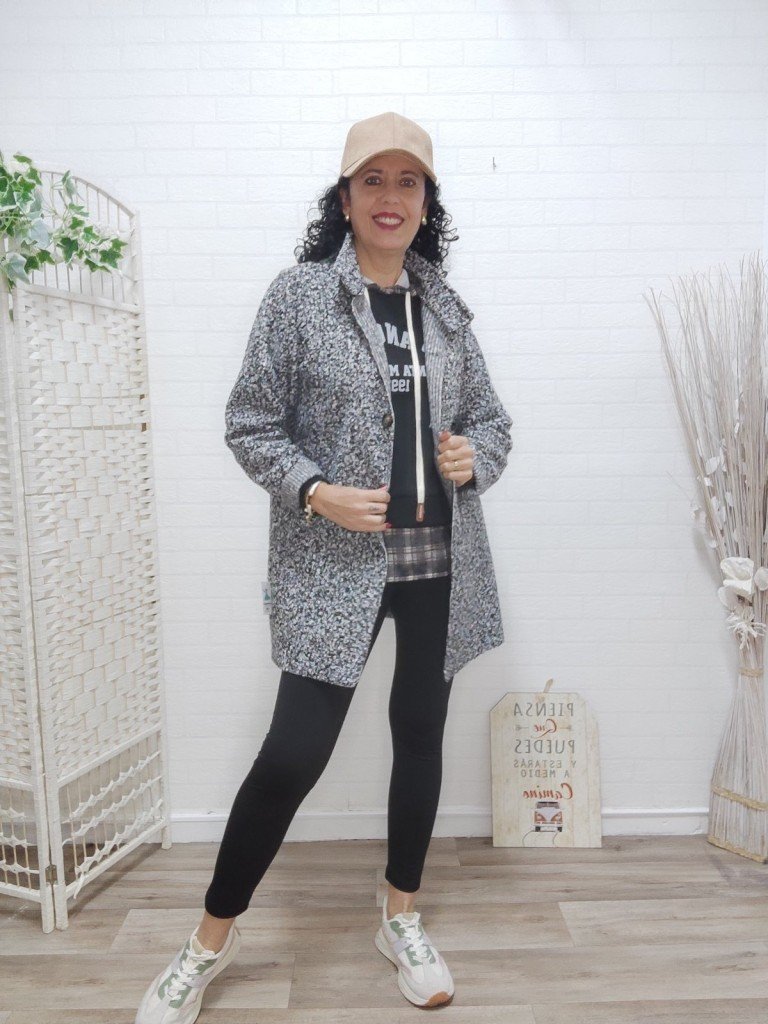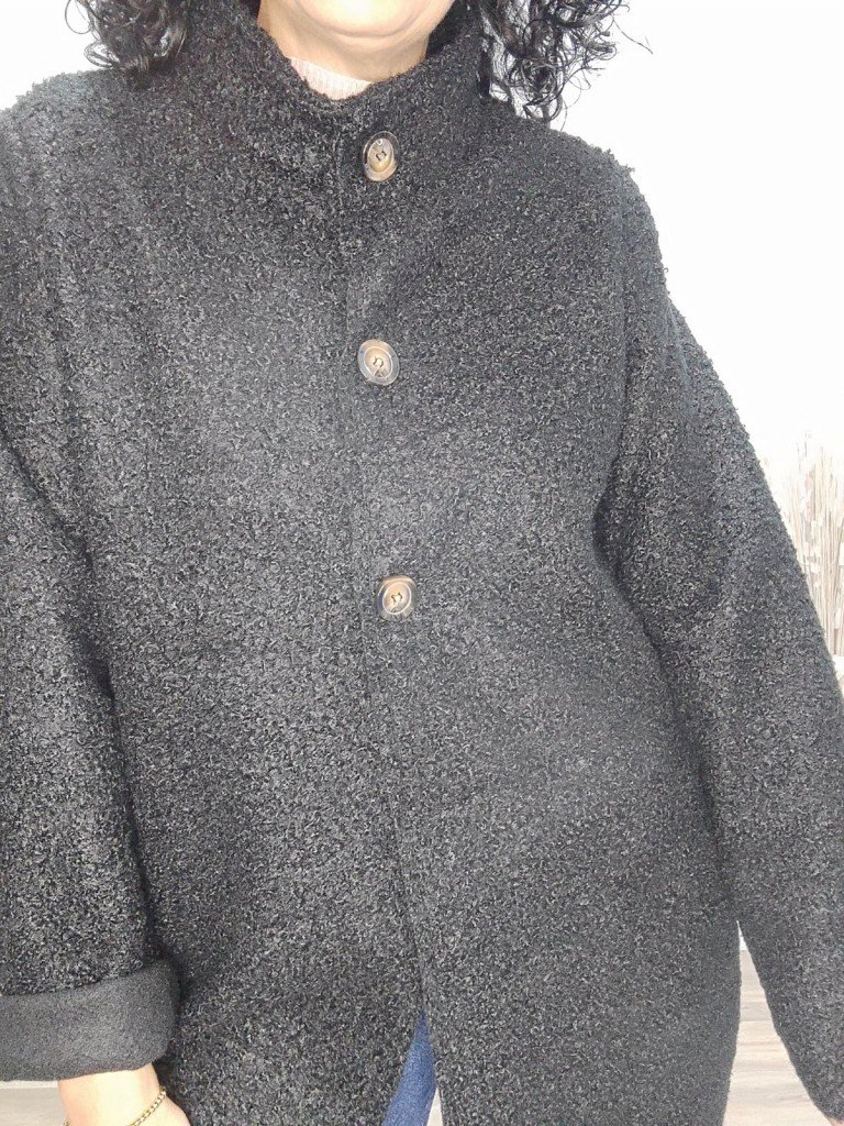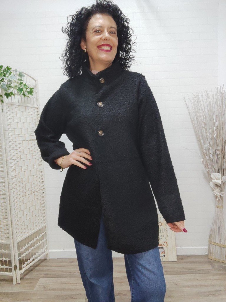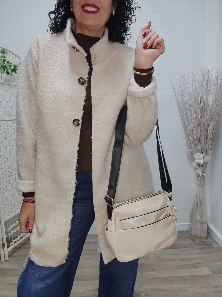Abrigo de borreguito tipo capa , con cierre de 3 botones y  abierto en la parte baja. No lleva bolsillos. NO LLEVA FORRO.