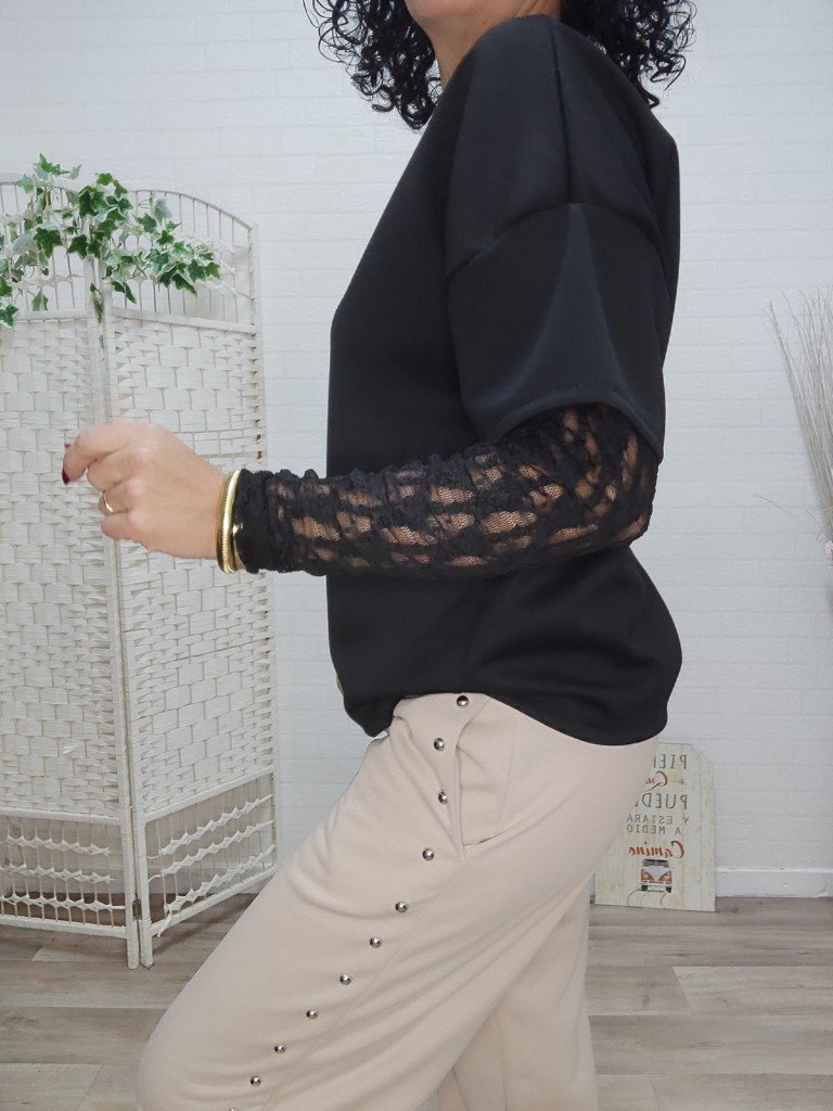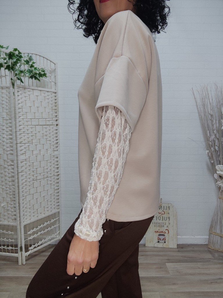 Sudadera deportiva con un fantástico tejido, la parte de las mangas el tejido deportivo es como si fuese mangas cortas, y la parte de abajo viene con encaje.