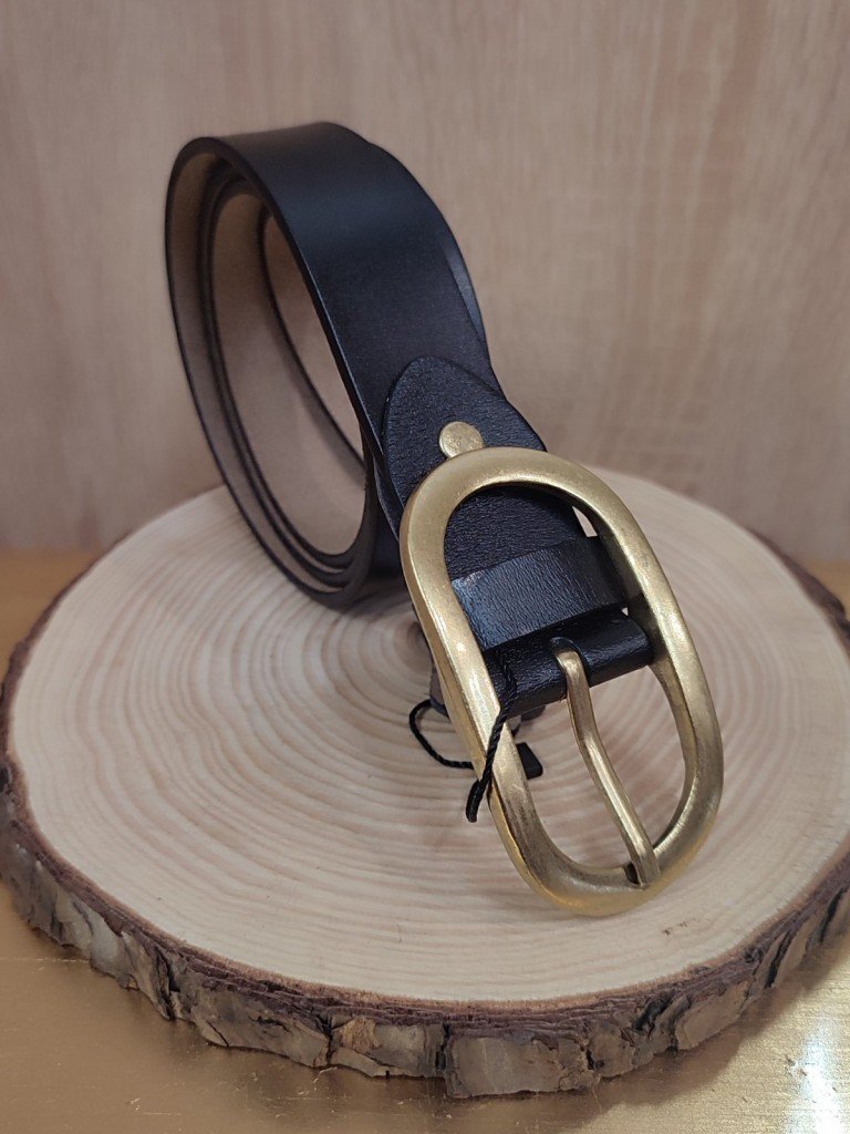 Cinturón de piel, liso en tono oscuro, con hebilla dorada.