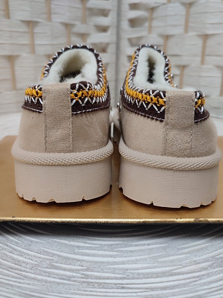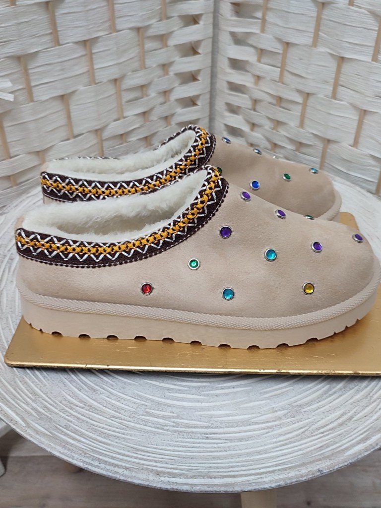 Precioso calzado de plataforma en antelina por la parte exterior acompañado de un precioso bordado y perlas de colores, su interior es todo de pelitos.