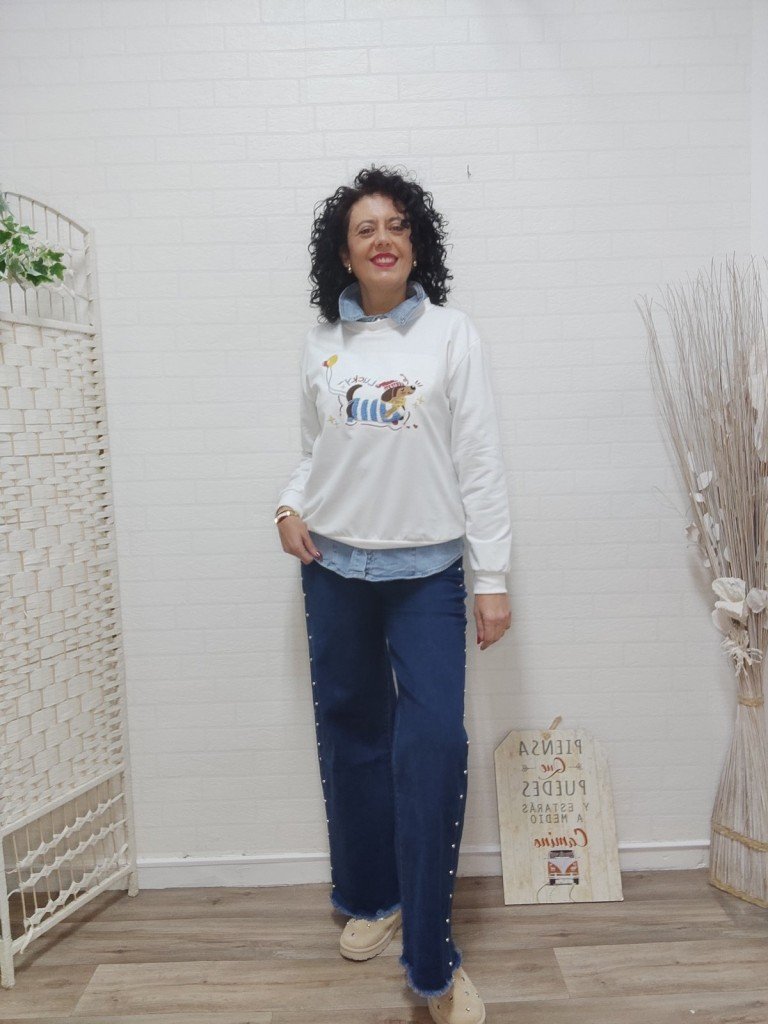 Sudadera deportiva pero ideal para vestir, lisa con adorno decorativo de un precioso perro en colores que le dará un toque más alegre. NO INCLUYE CAMISA VAQUERA.