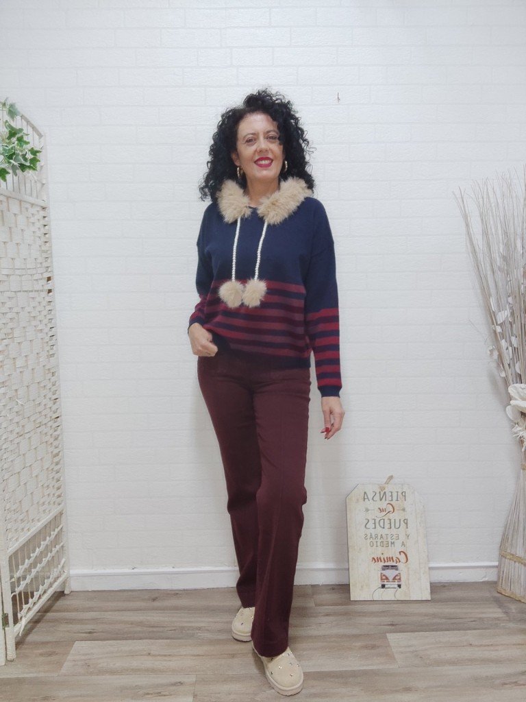Jersey con un punto apretadito muy agradable. Lleva gorro , no se puede quitar lo que si es desmontable es el pelo que lleva alrededor y los pompones.