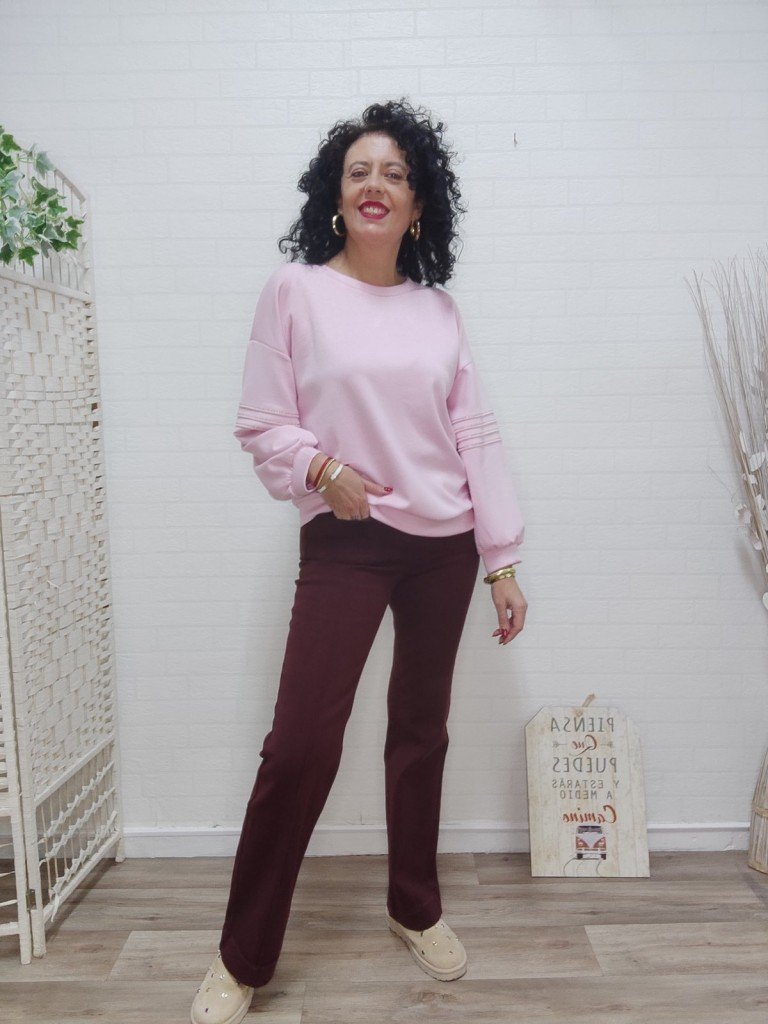 Pantalón vaquero en color burdeos. Corte recto. Cierre de cremallera y botón( detalle de nácar) Dos bolsillos frontales y dos en la parte de atrás. Talla 34/36/38/40/42.