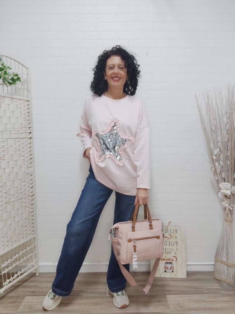 Sudadera deportiva con un tejido muy suave, con dibujo central de estrella con lentejuelas y relieve em los bordes.
