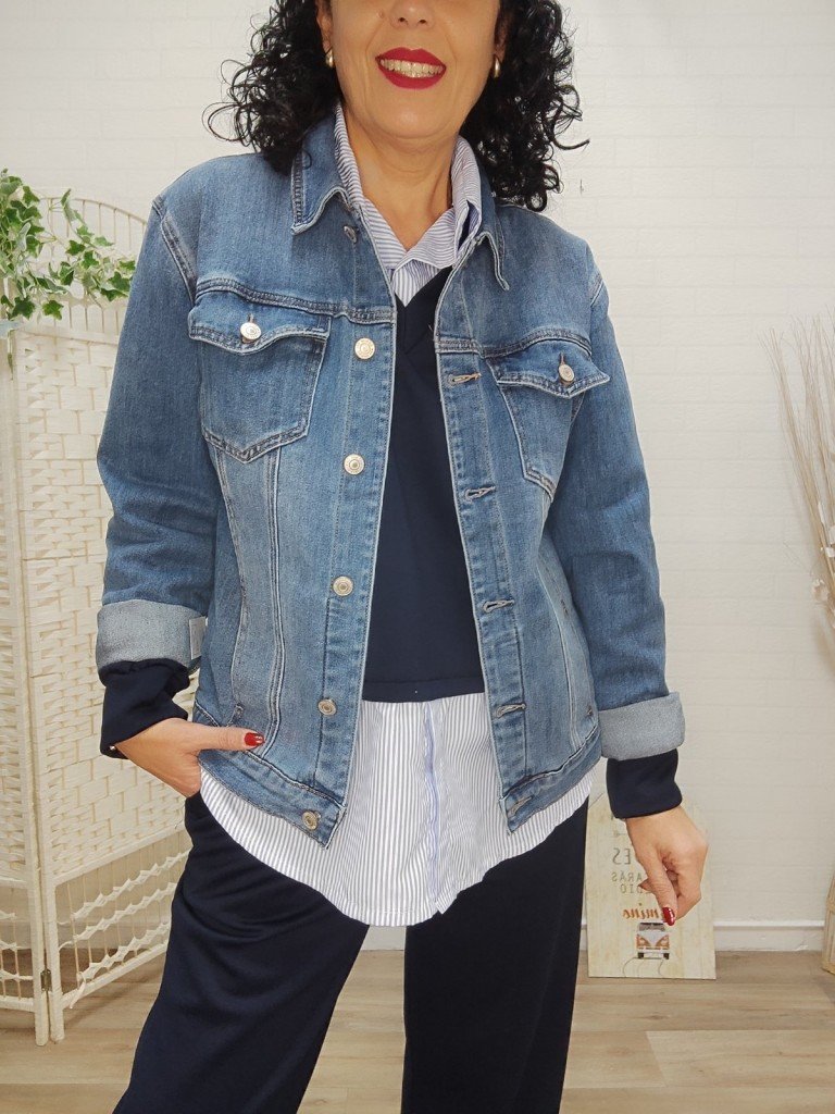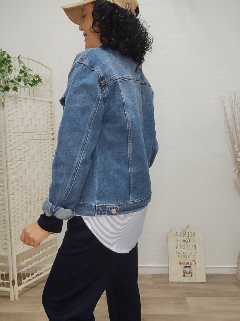 Chaqueta vaquera con cierre de botones, bolsillos delanteros y laterales. Talla 46/48/50/52.