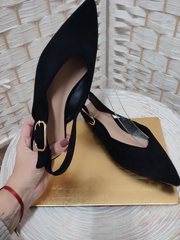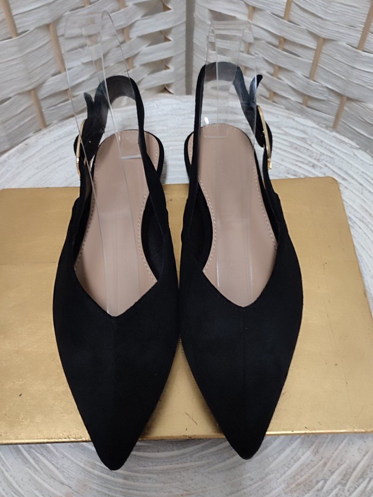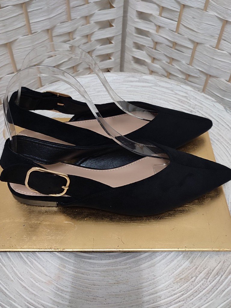 Manoletina en antelina, color negro un básico elegante y fácil de combinar. SU diseño de punta fina estiliza el pie, mientras que la tira trasera con hebilla en color dorada aporta sujeción . Incorpora plantilla acolchada que proporciona una pisada más cómoda y agradable. Tacón bajo de 1.5 cm resultan ideales para el día a día-