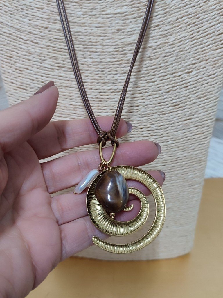 Añade un toque de distinción a tú look con éste collar de diseño artística. La pieza central presenta una elegante espiral dorada con textura estriada ,complementado con piedras en tono camel y beige. EL cordón marrón ofrece comodidad al llevar un nudo corredizo para adaptarlo a la altura que desees.