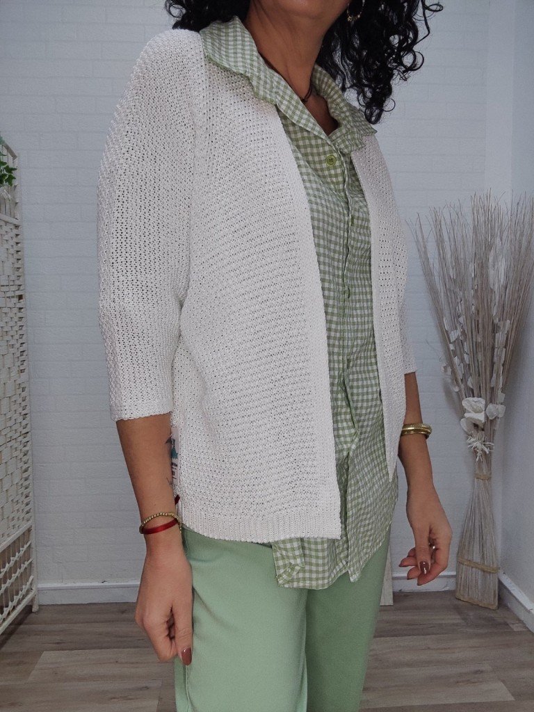 Rebeca de corte abierto ( no lleva cierre ) en color blanca, de punto calado transpirable. Mangas francesas.