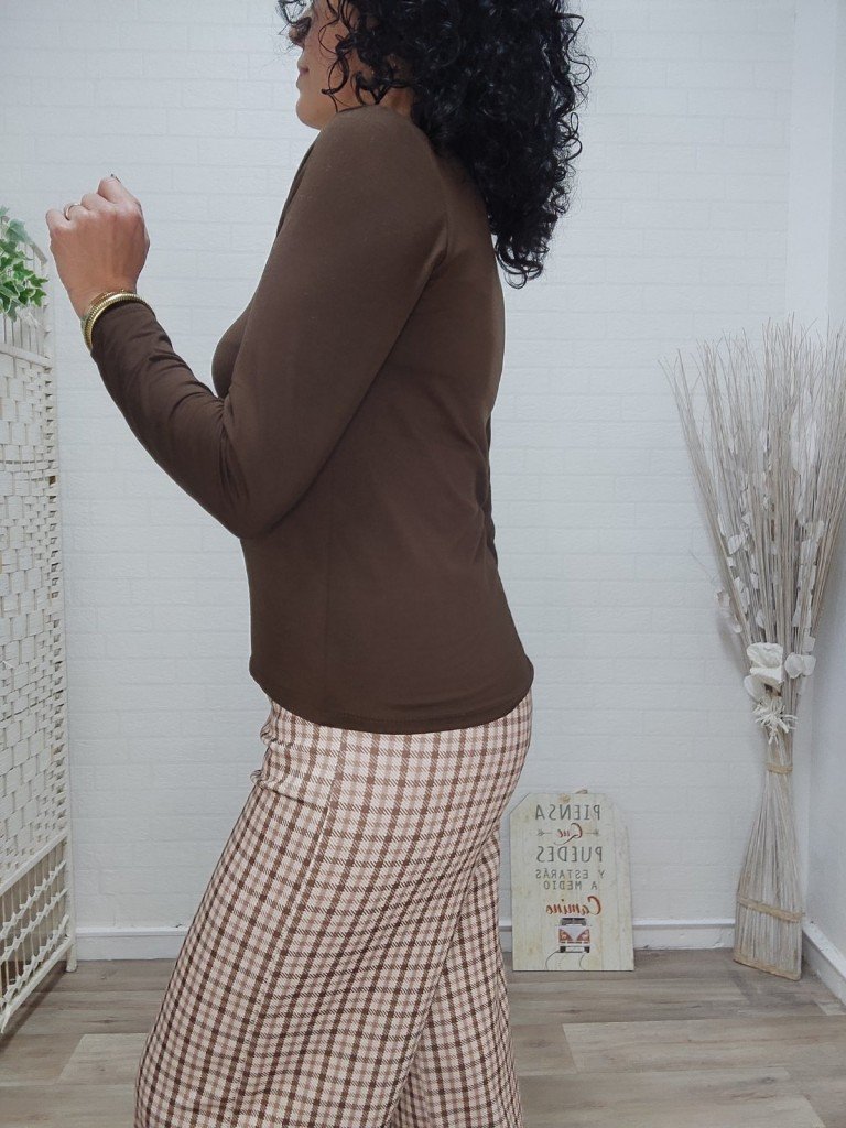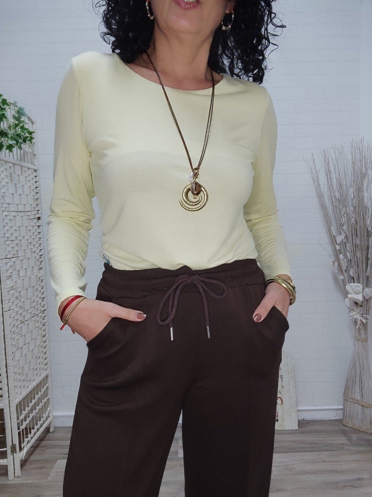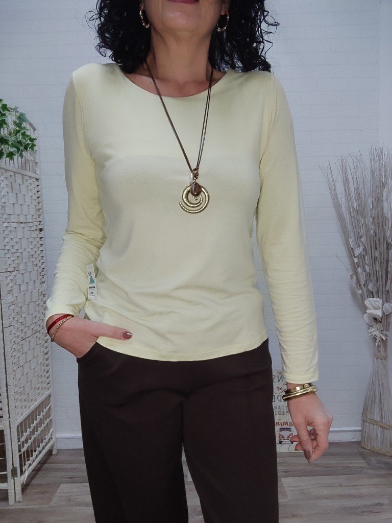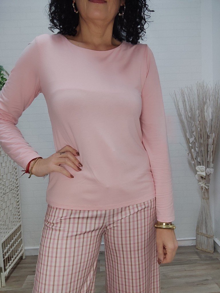 Camiseta básica de manga larga. Esencial, suave y diseñada para adaptarse perfectamente. Una prenda versátil con cuello redondo y tejido con elastán que garantiza comodidad todo el día. Talla única disponible rosa, marrón y amarillo pastel.