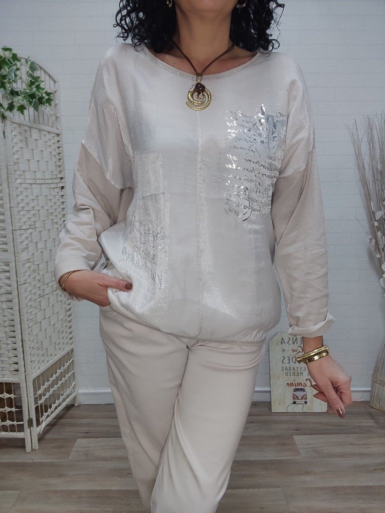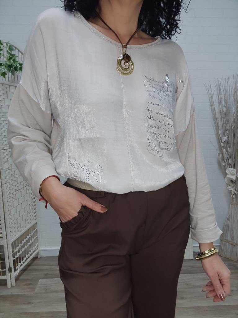 Preciosa camisa satinada por la parte delantera y tejido camiseta en la parte de la espalda. En la parte delantera lleva letras brillantes y perlas.