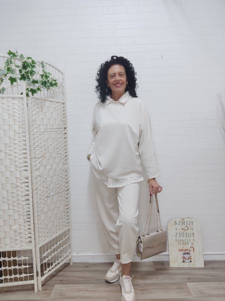 Conjunto de dos piezas en color beige formado por sudadera y pantalón. El pantalón es de cintura elástica ajustable y bolsillos laterales. Talla única desde 38/4 hasta 46 aproximadamente. Combínalo con camisa rayas Dunia en color beige. NO INCLUYE CAMISA.