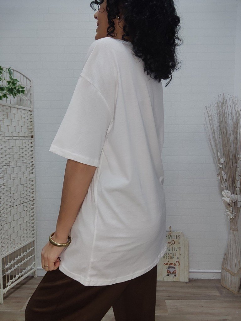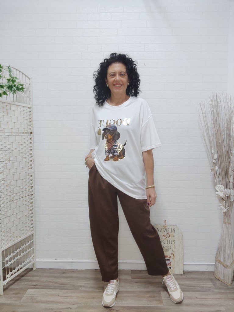 Camiseta de mangas cortas de talla grande, de corte recto. Es de color blanco con un precioso dibujo de perro con un corazón en purpurina dorado.