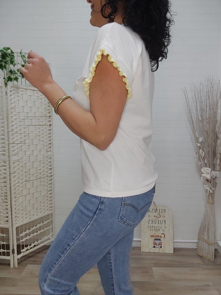 Camiseta blanca con dibujo frontal. Es una prenda que destaca por su exquisito acabado en ondas tanto en el cuello como en las mangas. Este detalle no solo aporta una textura preciosa sino que enmarca la silueta con un aire femenino ,romántico y chic.