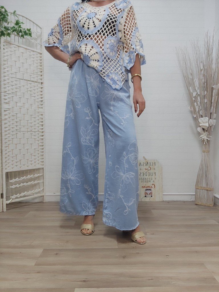Pantalón corte recto en color celeste con dibujos en blanco. Cintura elástica , NO lleva bolsillos. Recomendamos combinar con blusa TENERIFE.